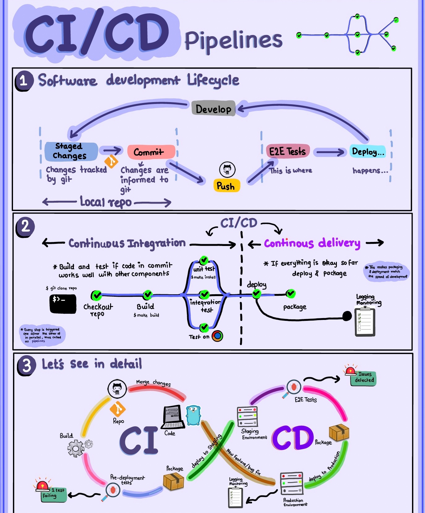 Als er nieuwe code naar een git-opslagplaats wordt gestuurd, start dit een automatisch bouw- en testproces. Er worden volledige testen gedaan om de code te checken. Als de testen goed zijn, wordt de code automatisch naar de voorbereidings- of productieomgeving gestuurd. Als er problemen zijn, gaat de code terug naar ontwikkeling om fouten te herstellen. Dit zorgt voor snelle terugkoppeling naar ontwikkelaars en minder fouten in de eindversie.